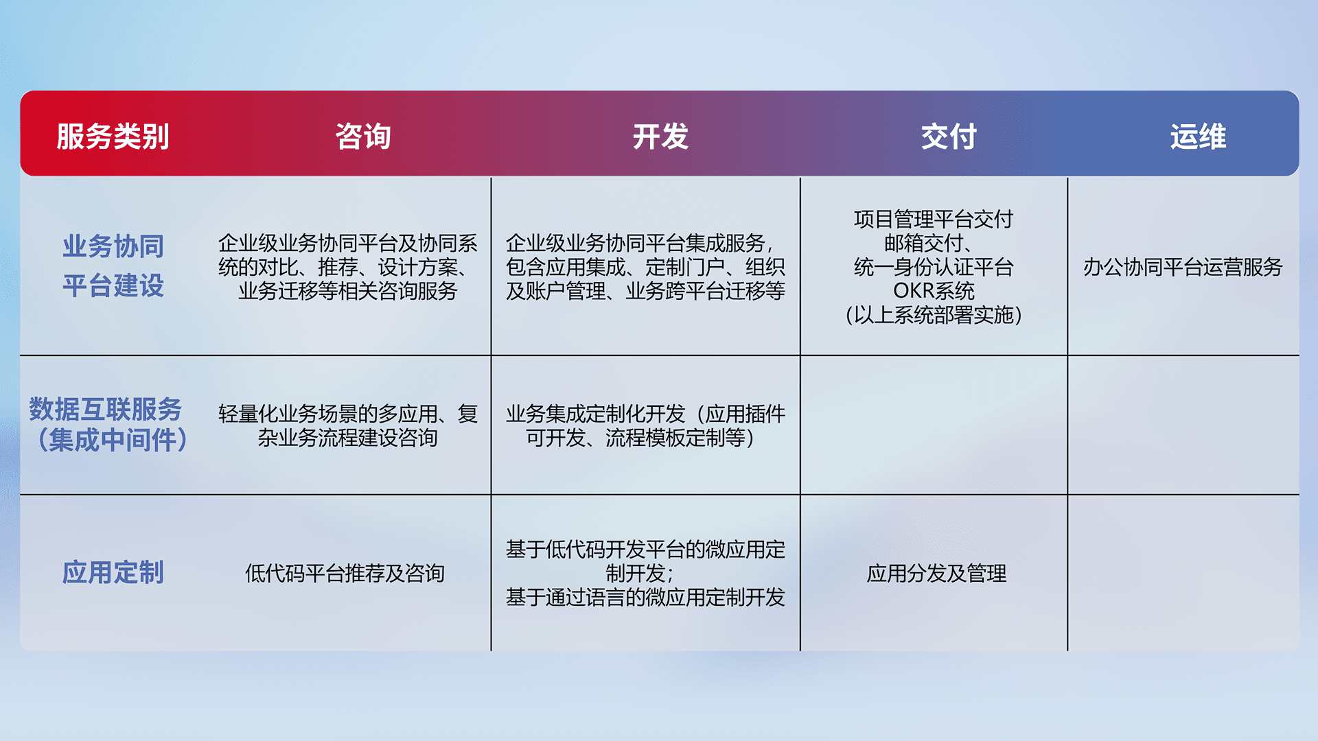 针对钉钉、、、、企微、、、IDaas等平台级产品提供产品的规划、、、方案、、交付、、、、定制化开发等服务,,实现如统一协同办公、、、、智能客户服务、、、、混合会议管理、、智能数据查询、、、等业务场景,,,,实现数字化转型。。