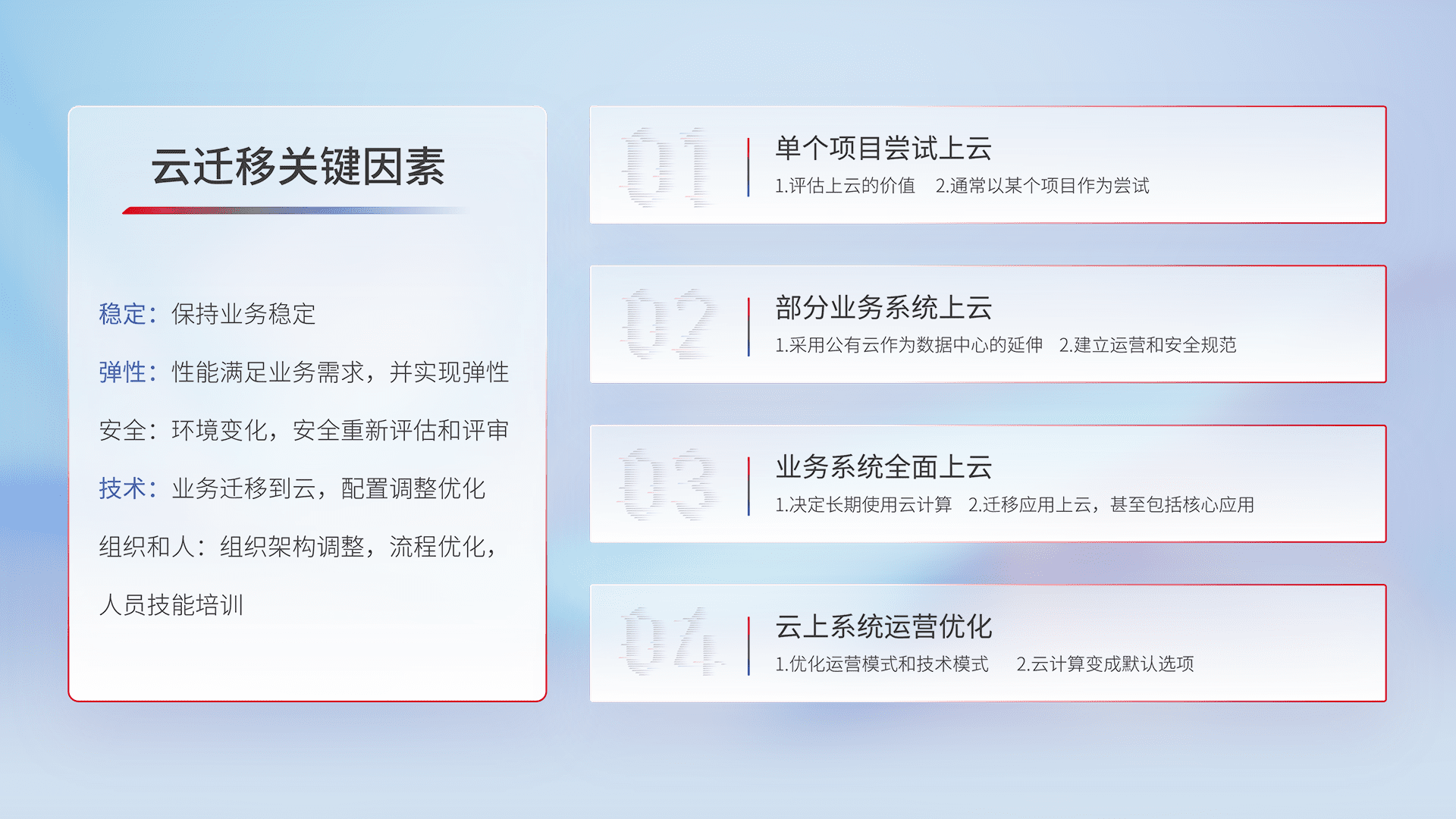 结合实际业务,,从规划设计、、、云平台选型、、、、云原生改造、、、数据迁移、、、、集成交付,,,,迁移全过程为客户识别最佳上云路径,,做好风险识别管理,,设计网络架构、、、身份权限、、、安全审计合规、、、操作审计、、、日志审计、、、监控告警策略、、、多站点容灾设计等,,对云上基础设施进行整体规划,,,,提升IT治理水平,,,以满足弹性、、、、高可用、、高性能的需求。。。。