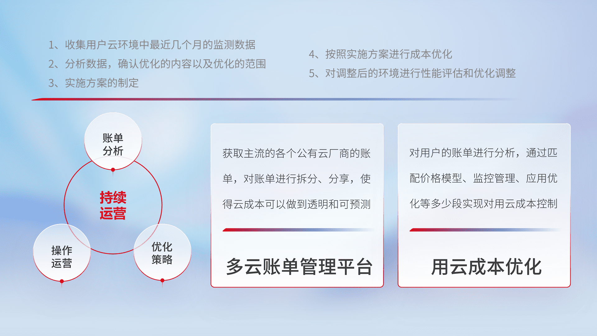 通过多云纳管,,,以统一的资源数据模型把客户的云资源进行抽象和封装,,,,进而实现对多云资源的统一操作,,保障云资源管理的可靠性、、稳定性与可用性。。量身定制化运维内容,,,,配置、、开发运维、、、补丁管理、、备份、、、、监控、、、认证和访问管理、、、审计和日常巡检等,,保障在用云过程中的可靠度,,,稳定度以及高可用率。。。。