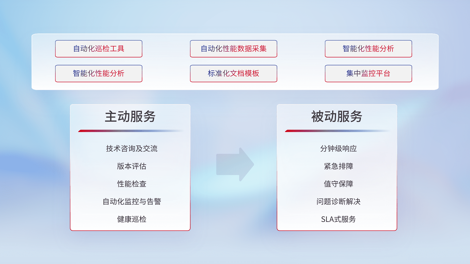 智能化工具和标准化文档,,,,保障服务质量,,提供主动服务(包含技术咨询、、、、版本评估、、、、性能检查、、自动化监控与告警、、、健康巡检)和被动服务包含(分钟级响应、、、、紧急排障、、、、值守保障、、、、问题诊断解决、、、SLA服务)。。。